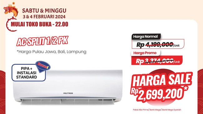 Salah satunya adalah AC Split 1/2 PK. Harga normal AC tersebut mulai dari Rp 4.199.000. Namun harga promonya mulai Rp 3.374.000. Jika menggunakan Allo Prime, Allo Paylater, kartu kredit Bank Mega atau Bank Mega Syariah maka pelanggan bisa mendapatkan AC tersebut mulai dari Rp 2.699.200. Artinya pelanggan setia hemat Rp 1.499.800 dari harga normal.