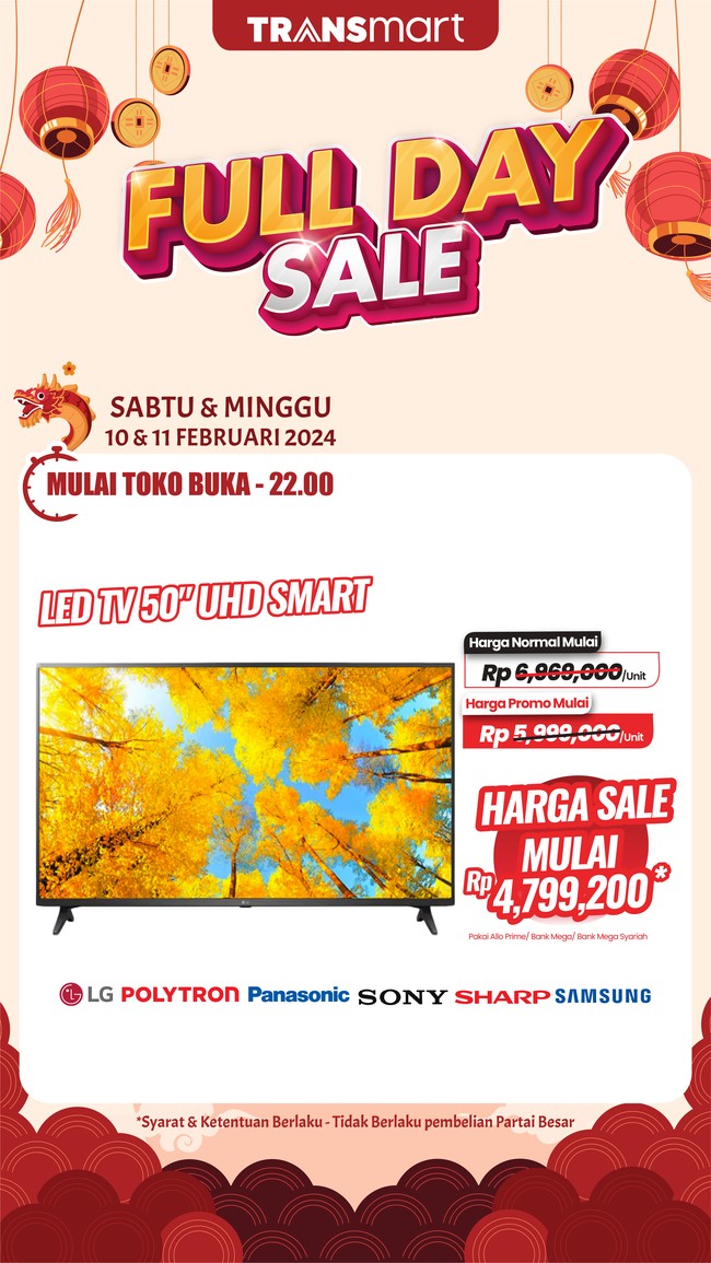 Transmart Full Day Sale kembali hadir Sabtu dan Minggu, 10-11 Februari 2024. Berbagai promosi menarik hadir untuk memenuhi kebutuhan para pelanggan setia Transmart seperti barang elektronik.