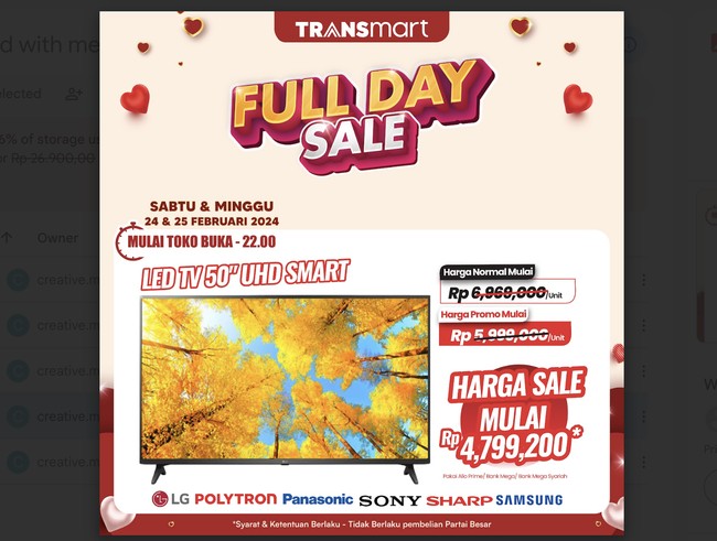 Transmart Full Day Sale kembali hadir Sabtu dan Minggu, 24-25 Februari 2024. Berbagai promosi menarik hadir untuk memenuhi kebutuhan para pelanggan setia Transmart seperti barang elektronik.