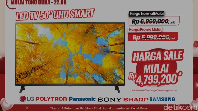 Salah satunya adalah TV LED 50" UHD Smart. Harga normal TV tersebut mulai dari Rp 6.969.000. Namun harga promonya mulai Rp 5.999.000. Jika menggunakan Allo Prime, Allo Paylater, kartu kredit Bank Mega atau Bank Mega Syariah maka pelanggan bisa mendapatkan TV tersebut mulai dari Rp 4.799.200. Artinya pelanggan setia hemat Rp 2.169.800 dari harga normal.