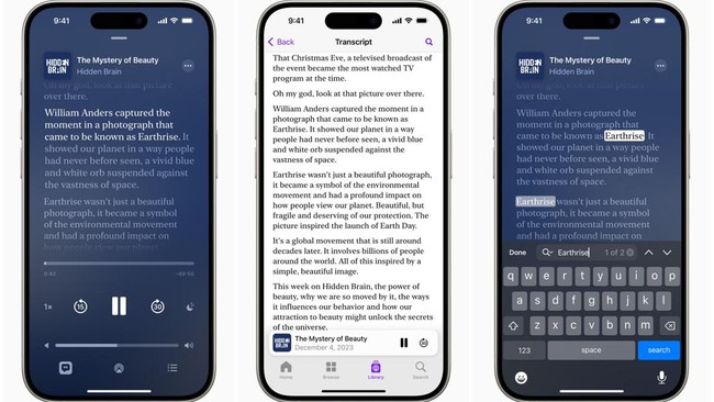 Dengan transkrip, pengguna dapat membaca teks lengkap dari sebuah episode dan mencari kata atau frasa tertentu di episode. Pengguna dapat pula ketuk teks untuk memutar podcast dari titik tersebut di episode tersebut. Ketika sebuah episode bermain, setiap kata disorot sesuai ucapan ini sehingga mudah diikuti.