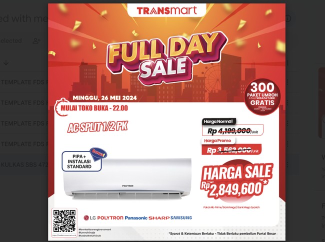 Salah satunya adalah AC Split 1/2 PK. Harga normal AC tersebut mulai dari Rp 4.199.000. Namun harga promonya mulai Rp 3.562.000.