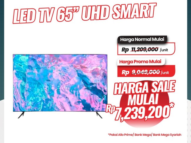 Televisi kedua adalah LED TV 65" UHD Smart dari berbagai merk. Produk itu ditawarkan dengan harga promo mulai Rp 7.239.200 jika dibeli menggunakan Allo Prime, Allo Paylater dan kartu kredit Bank Mega atau Bank Mega Syariah.