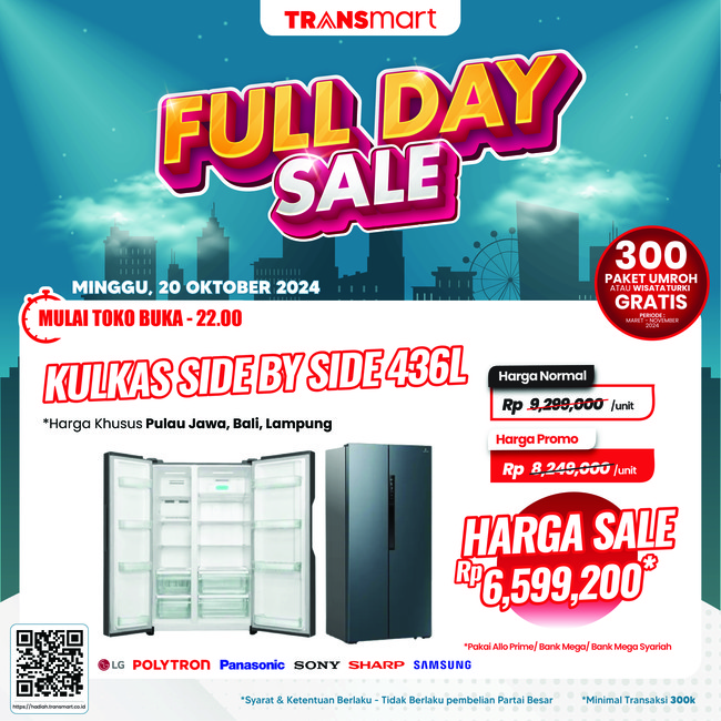 Diskon besar-besaran bisa diperoleh pelanggan yang bertransaksi menggunakan Allo Prime, Allo Paylater dan kartu kredit Bank Mega atau Bank Mega Syariah. Barang elektronik menjadi yang paling banyak mendapatkan diskon gede-gedean di Transmart Full Day Sale.