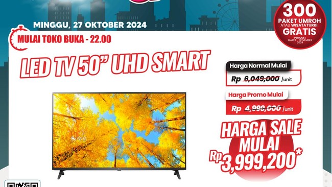 Transmart Full Day Sale kembali hadir Minggu, 27 Oktober 2024. Berbagai promosi menarik hadir untuk para pelanggan setia Transmart seperti TV LED.
