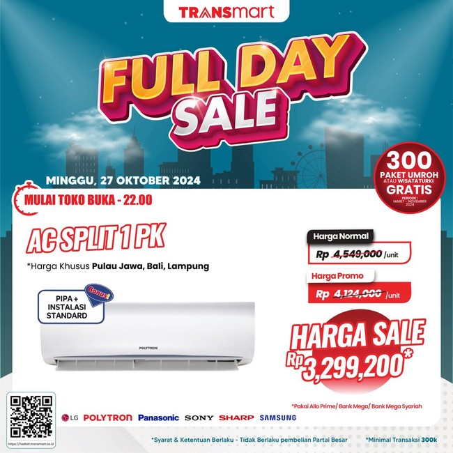 Transmart Full Day Sale kembali hadir Minggu, 27 Oktober 2024. Berbagai promosi menarik hadir untuk para pelanggan setia Transmart seperti AC split 1 PK.
