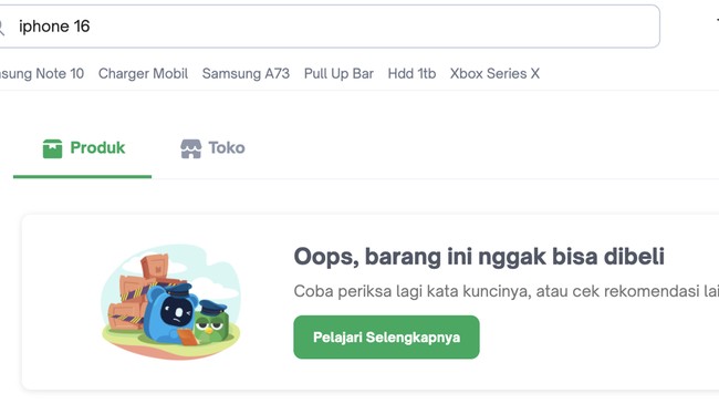 "Oops, barang ini nggak bisa dibeli. Coba periksa lagi kata kuncinya, atau cek rekomendasi lainnya," tulis Tokopedia dalam keterangan di situsnya.
