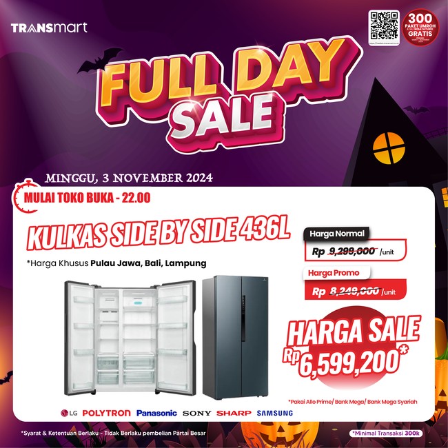 Diskon besar-besaran bisa diperoleh pelanggan yang bertransaksi menggunakan Allo Prime, Allo Paylater dan kartu kredit Bank Mega atau Bank Mega Syariah. Barang elektronik menjadi yang paling banyak mendapatkan diskon gede-gedean di Transmart Full Day Sale.