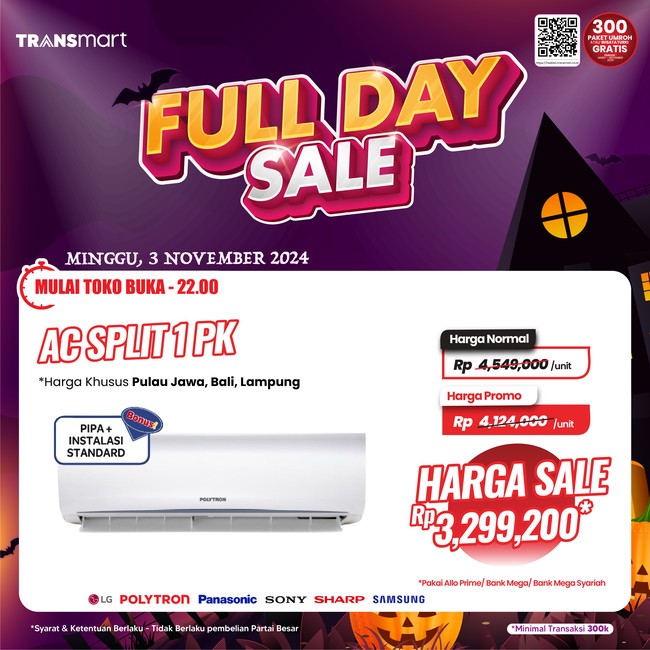 Untuk di luar pulau Jawa, Bali, dan Lampung, harga normal AC tersebut mulai dari Rp4.649.000. Namun harga promonya mulai Rp4.249.000. Jika menggunakan Allo Prime, Allo Paylater, kartu kredit Bank Mega atau Bank Mega Syariah maka pelanggan bisa mendapatkan AC tersebut mulai dari Rp 3.339.200. Artinya pelanggan setia hemat Rp1.309.800 dari harga normal.