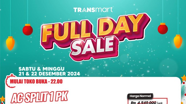 Transmart Full Day Sale kembali hadir Minggu, 22 Desember 2024. Berbagai promosi menarik hadir untuk memenuhi kebutuhan para pelanggan setia Transmart seperti barang elektronik.