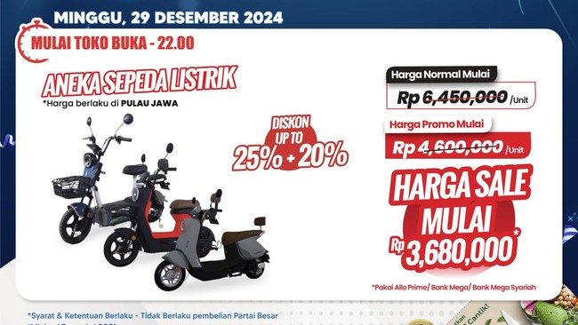 Salah satunya adalah sepeda listrik. Harga normal E-Bike ini di Pulau Jawa adalah Rp6.450.000, dengan harga promo mulai dari Rp4.600.000. Jika menggunakan Allo Prime, Allo Paylater, kartu kredit Bank Mega, atau Bank Mega Syariah maka pelanggan bisa mendapatkan sepeda tersebut mulai dari Rp 3.680.000.