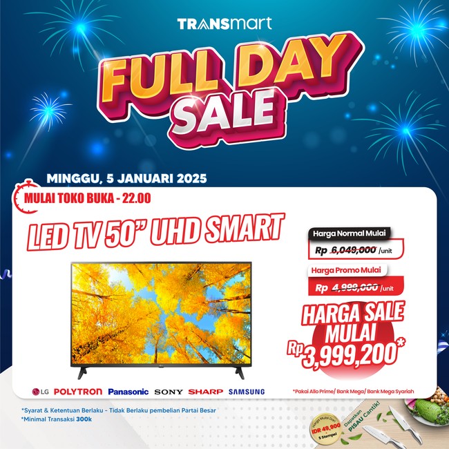 Transmart Full Day Sale kembali hadir Minggu, 5 Januari 2025. Berbagai promosi menarik hadir untuk memenuhi kebutuhan para pelanggan setia Transmart seperti barang elektronik.