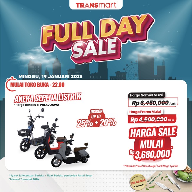 Transmart Full Day Sale kembali hadir Minggu, 19 Januari 2025. Berbagai promosi menarik hadir untuk memenuhi kebutuhan para pelanggan setia Transmart seperti barang elektronik.