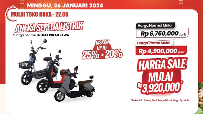 Namun bila ingin lebih murah lagi, pelanggan dapat menggunakan Allo Prime, Allo Paylater, kartu kredit Bank Mega, atau Bank Mega Syariah. Dengan begitu, sepeda listrik ini bisa dibeli mulai Rp 3.920.000.