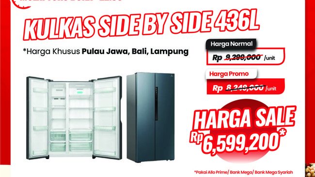 Salah satunya adalah kulkas Side By Side 436L. Harga normal kulkas ini mulai di Pulau Jawa, Bali, dan Lampung sebesar Rp 9.299.000. Namun dengan promo, pengguna dapat membelinya di harga Rp 8.249.000.