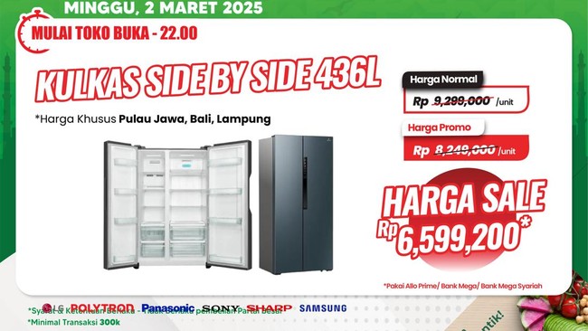 Salah satunya adalah kulkas Side By Side 436L. Harga normal kulkas ini mulai di Pulau Jawa, Bali dan Lampung adalah Rp9.299.000 namun dengan promo pengguna dapat membelinya di harga Rp8.249.000.