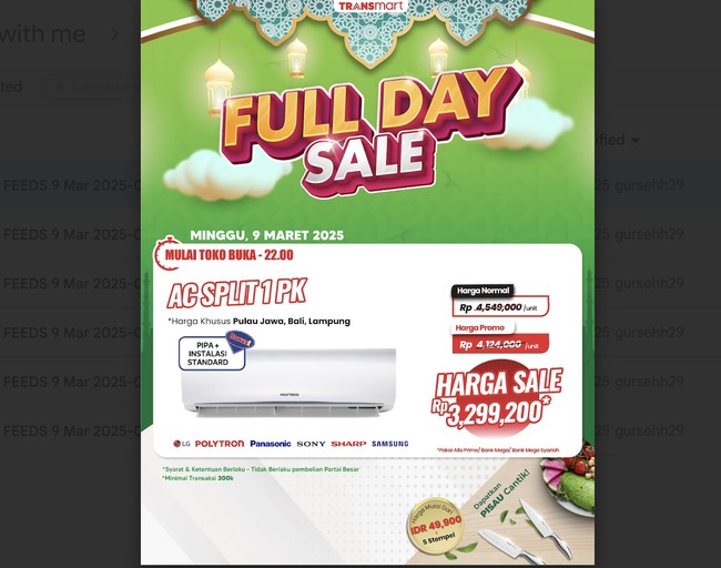 Transmart Full Day Sale kembali hadir Minggu, 9 Maret 2024. Berbagai promosi menarik hadir untuk memenuhi kebutuhan para pelanggan setia Transmart seperti barang elektronik.