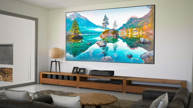 Untuk sensasi bioskop premium, Epson EH-LS800B wajib masuk daftar. Proyektor ultra-short-throw ini bisa memproyeksikan layar 100 inci hanya dari jarak 9,8 cm dari dinding, menjadikannya salah satu yang terpendek di kelasnya.