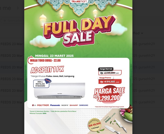 Transmart Full Day Sale kembali hadir Minggu,23 Maret 2024. Berbagai promosi menarik hadir untuk memenuhi kebutuhan para pelanggan setia Transmart seperti barang elektronik.