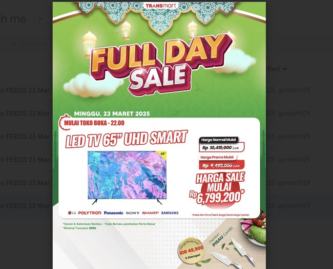 Transmart Full Day Sale kembali hadir Minggu, 23 Maret 2025 mulai dari toko buka sampai jam 22.00. Berbagai promosi menarik hadir untuk memenuhi kebutuhan para pelanggan setia Transmart seperti barang elektronik.