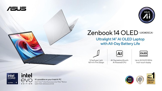 ASUS memahami tren tersebut dengan menghadirkan ASUS Zenbook 14 OLED (UX3405CA), sebuah laptop AI tipis berdesain premium yang memadukan portabilitas tinggi dengan performa luar biasa. Laptop ini menjadi yang pertama di Indonesia yang ditenagai prosesor Intel® Core™ Ultra Series 2, menghadirkan efisiensi daya dan performa AI yang lebih cerdas.