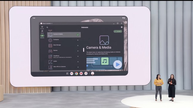 Engineer Manager Google Florina Muntenescu juga memperlihatkan fitur adaptive apps yang membuat jendela aplikasi bisa digeser-geser dan diubah ukurannya pada layar. Pada bagian kiri layar terlihat tampilan jam sementara sinyal WiFi dan baterai ada pada bagian kanan.