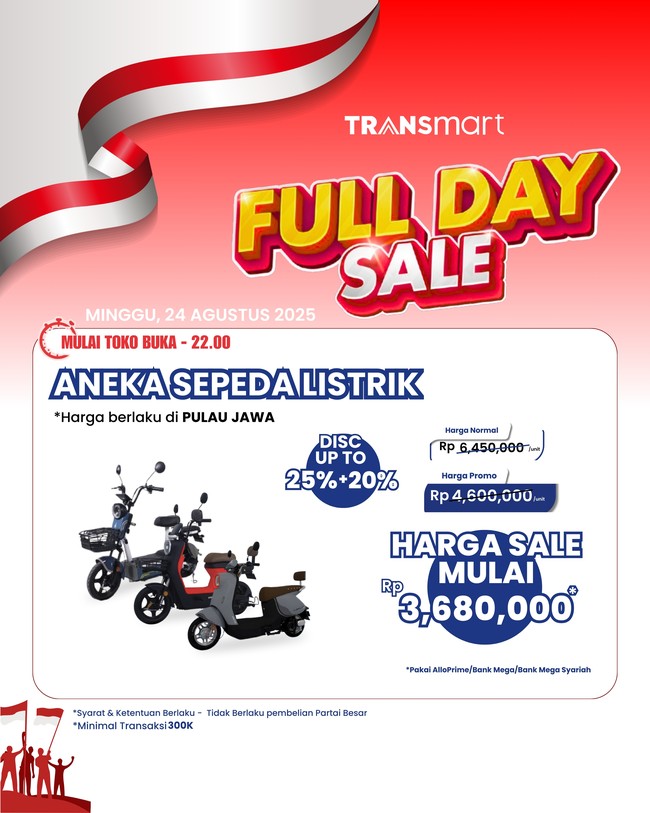 Transmart Full Day Sale kembali hadir Minggu, 24 Agustus 2025. Berbagai promosi menarik hadir untuk memenuhi kebutuhan para pelanggan setia Transmart seperti aneka sepeda listrik.