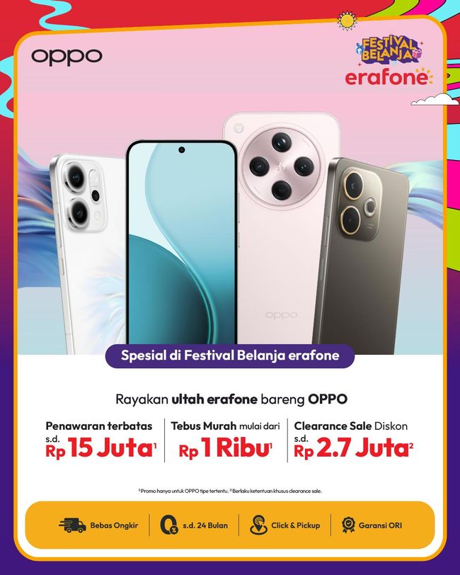 Dengan diskon fantastis ini, memiliki smartphone impian bukan lagi sekadar angan-angan. Manfaatkan promo OPPO ini untuk mendapatkan teknologi terbaik dari OPPO dengan harga yang jauh lebih terjangkau hanya di Festival Belanja erafone 2025.