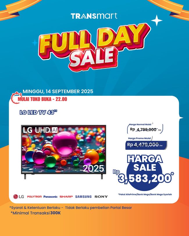 Transmart Full Day Sale kembali hadir Minggu, 14 September 2025. Berbagai promosi menarik hadir untuk memenuhi kebutuhan para pelanggan setia Transmart seperti smart LED TV.