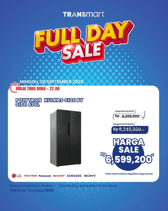 Transmart Full Day Sale kembali hadir Minggu, 27 September 2025. Berbagai promosi menarik hadir untuk memenuhi kebutuhan para pelanggan setia Transmart seperti barang elektronik.