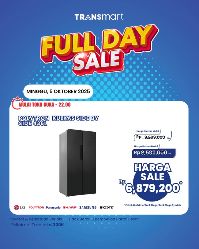 Diskon besar-besaran bisa diperoleh pelanggan yang bertransaksi menggunakan Allo Prime, Allo Paylater dan kartu kredit Bank Mega atau Bank Mega Syariah. Barang elektronik menjadi yang paling banyak mendapatkan diskon gede-gedean di Transmart Full Day Sale.