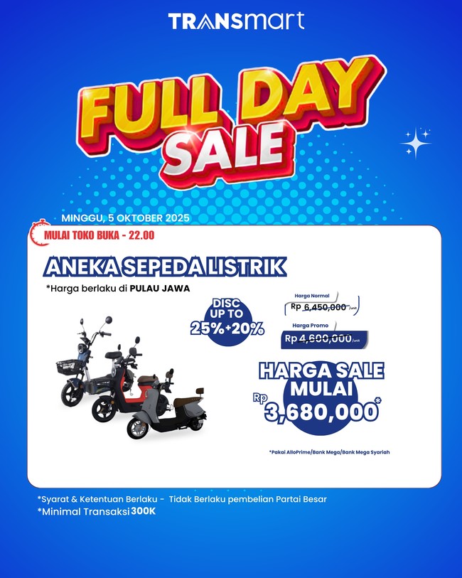 Transmart Full Day Sale kembali hadir Minggu, 5 Oktober 2025. Berbagai promosi menarik hadir untuk memenuhi kebutuhan para pelanggan setia Transmart seperti aneka sepeda listrik.