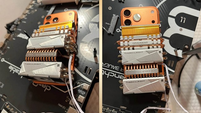TK-Tronix memasang lima heatsink SSD M.2 berukuran besar di bagian belakang iPhone 17 Pro Max. Heatsink-heatsink tersebut aslinya dirancang untuk mendinginkan SSD PCIe Gen 5 di PC high-end, lengkap dengan pipa tembaga dan kipas mini.