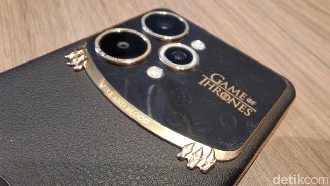 Menggenggam HP ini, salah satu yang bakal langsung terasa adalah panel belakang berbahan kulit imitasi dengan warna hitam. Kalau mau dibayangkan, mungkin mirip-mirip rasanya ketika Daenerys Targaryen mengelus Drogon, naga jagoannya. Di bodi belakang ada pula sosok naga berkepala tiga khas Targaryen, ditemani tulisan 'Fire and Blood' di atasnya.