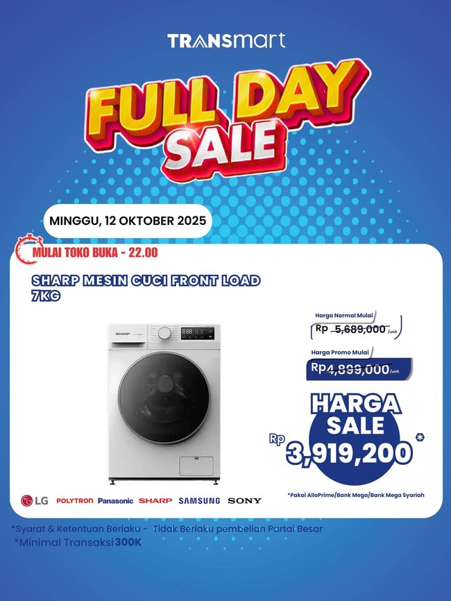 Transmart Full Day Sale kembali hadir Minggu, 12 Oktober 2025. Berbagai promosi menarik hadir untuk memenuhi kebutuhan para pelanggan setia Transmart seperti mesin cuci front load 7 kg.
