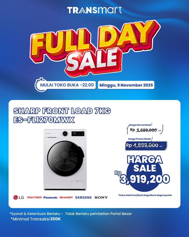 Transmart Full Day Sale kembali hadir Minggu, 9 November 2025. Berbagai promosi menarik hadir untuk memenuhi kebutuhan para pelanggan setia Transmart seperti mesin cuci front load 7 kg.