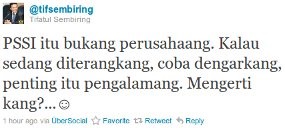 "PSSI itu bukang perusahaang. Kalau sedang diterangkang, coba dengarkang, penting itu pengalamang. Mengerti kang?..." tulis @tifsembiring, Selasa (1/3/2011).