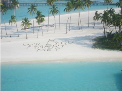 Di atas langit, nampak sebuah kalimat di atas pasir putih pantai yang sudah dipersiapkan dengan tulisan "B, Will You Marry Me?"