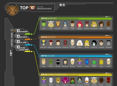 Network Insight pun mengelompokkan karakter Marvel ini menjadi beberapa bagian yakni The Avengers, The Mutan, The Villains, serta Top 10 Cosmic Characters. Seperti detikInet kutip dari Mashbale, Senin (16/7/2012).