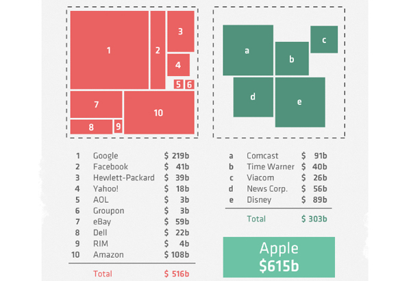 Berikut jika Apple 'dikeroyok' dengan raksasa teknologi dan media. Gabungan Google, Facebook, dan lainnya juga masih kalah mahal dari Apple. Termasuk jika dibandingkan dengan Disney cs.