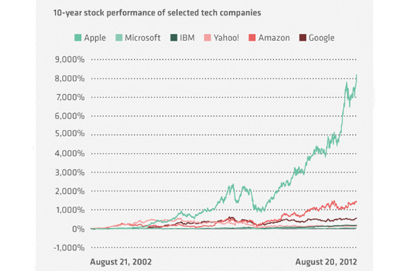 Gambar di atas adalah pergerakan saham Apple dan perusahaan teknologi lainnya. Dalam 10 tahun terakhir, saham Apple melesat 8.000%. Luar biasa!