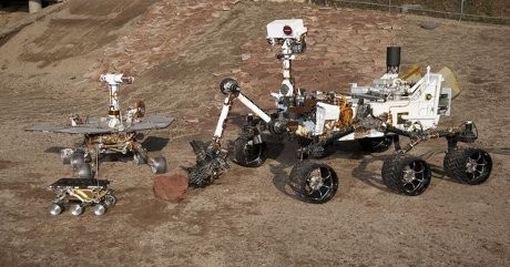 Sementara robot yang berukuran sedang mendarat di Mars pada tahun 2004. Kemudian, robot yang paling kanan adalah robot prototipe Curiosity yang digunakan untuk kepentingan uji coba