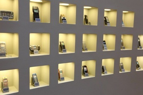 Salah satu sudut kantor Nokia pun dihiasi dengan rak yang berisi unit ponsel apa saja yang pernah mereka luncurkan, dari dulu sampai sekarang. Tampaknya, model ponsel pada foto ini ada yang cukup familiar.
