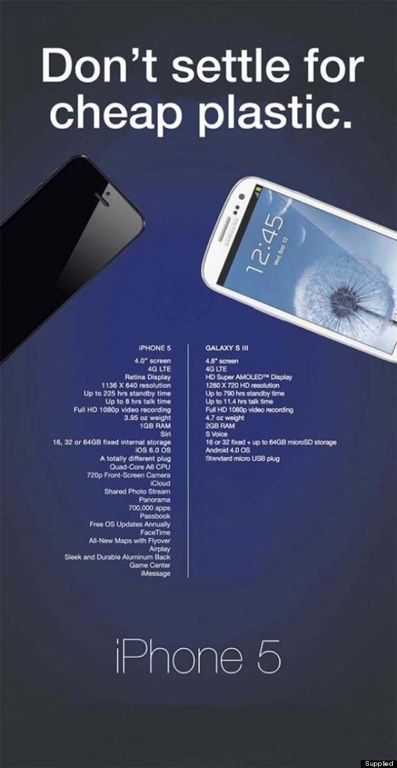 Dalam iklan tersebut, Samsung menampakkan dua foto ponsel, iPhone 5 dan Galaxy S III. Kemudian di bawahnya, ditayangkan spesifikasi keduanya. Dari layar, konektivitas, ketahanan baterai, hingga fitur perintah suara.