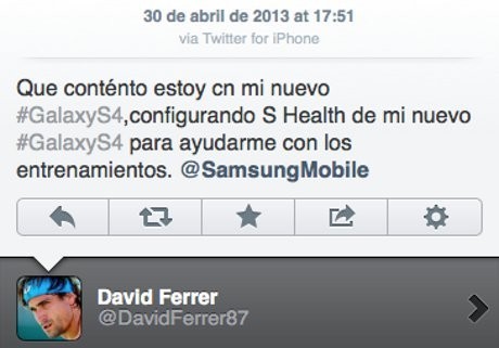 Hal ini dilakukan saat Samsung memilih bintang tenis asal Spanyol, David Ferrer, untuk mempromosikan Galaxy S4 melalui Twitter kepada 350 ribu follower-nya.