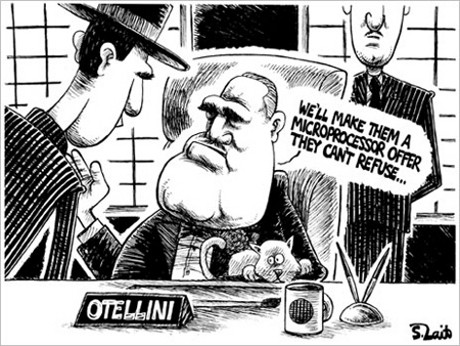 Otellini pun dibuat memplesetkan kalimat terkenal film itu. "Kita akan ajukan penawaran microprosesor yang tidak bisa ditolak," sebut tokoh itu. Dalam kesempatan lain Otellini digambarkan sedang duduk di atas sebuah bom waktu. Bom itu berlabelkan 'Larabee'.