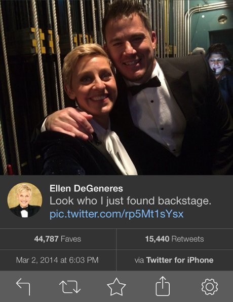 Seperti diketahui, tweetpic Ellen saat ber-selfie dengan para nominator Academy Awards di-retweet 1,5 juta kali dan menjadi favorit 750 ribu tweeps, hanya dalam waktu setengah jam setelah foto tersebut di-upload. Foto selfie tersebut, memecahkan rekor sebagai foto dengan jumlah retweet paling banyak di Twitter.