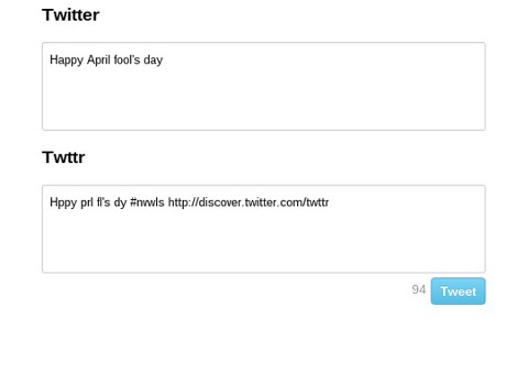 Ingin menggunakan huruf vokal? Maka user diwajibkan untuk membayar USD 5 sebulan untuk mendapatkan layanan premium dengan huruf lengkap. Ternyata akhirnya, Twitter berbayar ini diketahui hanya lelucon April Mop.