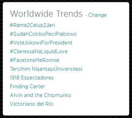 Ketika dikunjungi detikINET, sampai pukul 12.54 WIB, tiga tanda pagar (tagar) paling populer di trending topic worldwide adalah #Rame2Celup2Jari dengan 72,5 ribu twit, #SudahCoblosPeciPrabowo dengan 28,2 ribu twit, dan #VoteJokowiForPresident dengan 31 ribu twit.