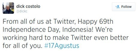 βDari keluarga besar Twitter, Dirgahayu Republik Indonesia! Kami terus bekerja keras untuk membuat Twitter menjadi lebih baik untuk anda. #17Agustus,β kicau @dickc yang merupakan bos Twitter, Dick Costolo pada halaman akunnya.